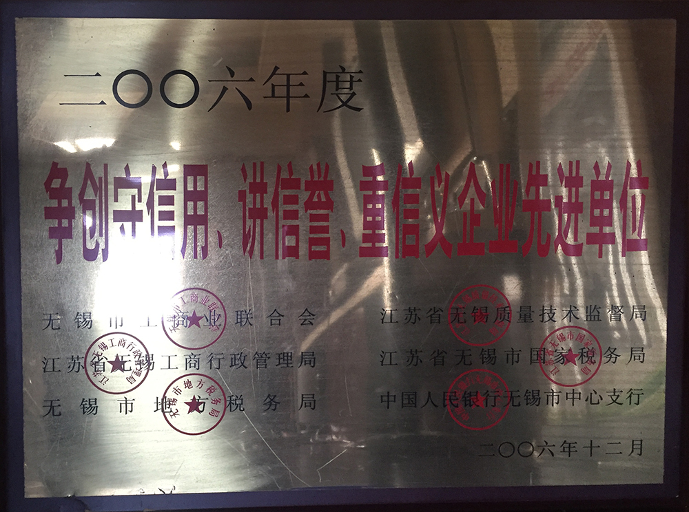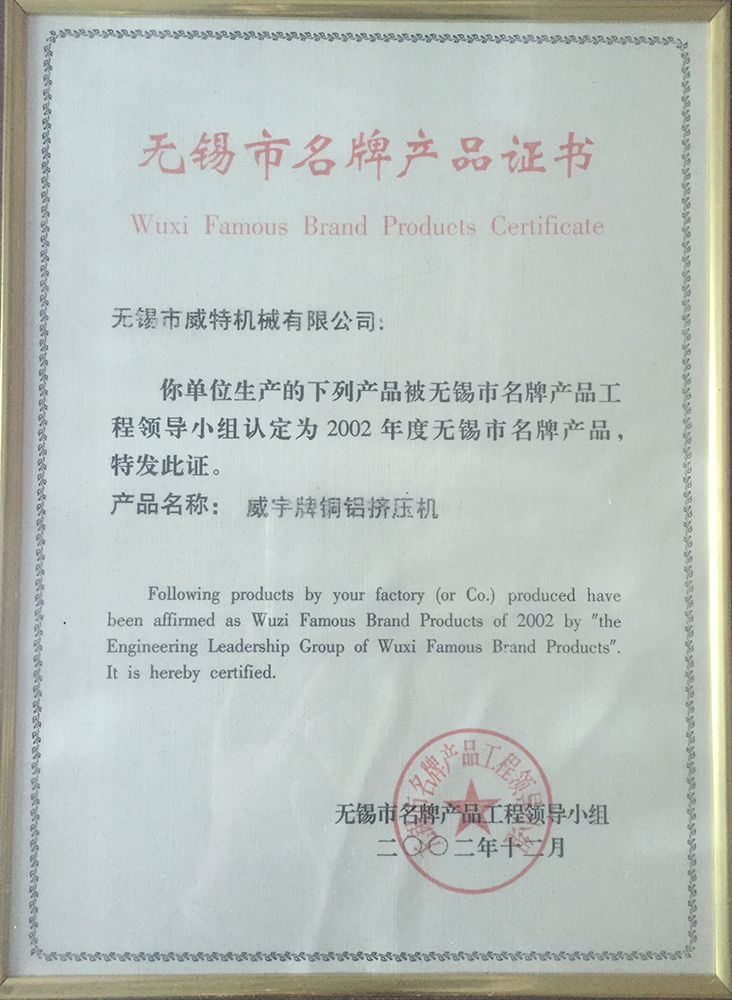无锡市名牌产品证书